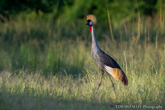I’ve been watching a pair of Crowned Cranes nesting in the long grasses of a swampy area over the last few weeks. When I drove past yesterday, I was a bit surprised not to find them there. I thought that perhaps they were nestled down in the grass, or perhaps had been chased off by a predator. What I had not considered was that they had reared the chicks and they were out foraging together!