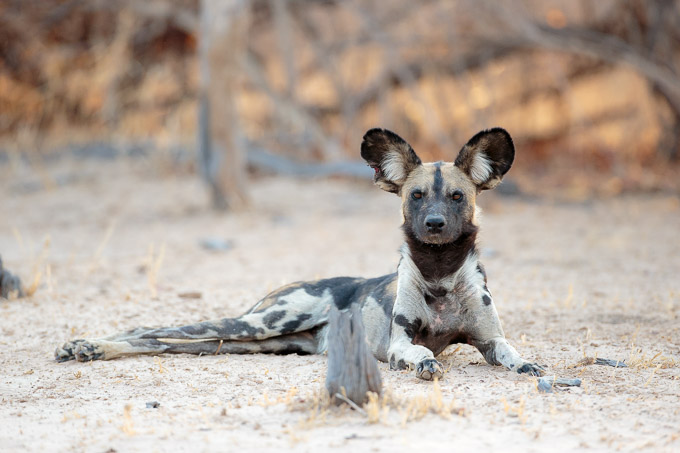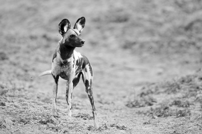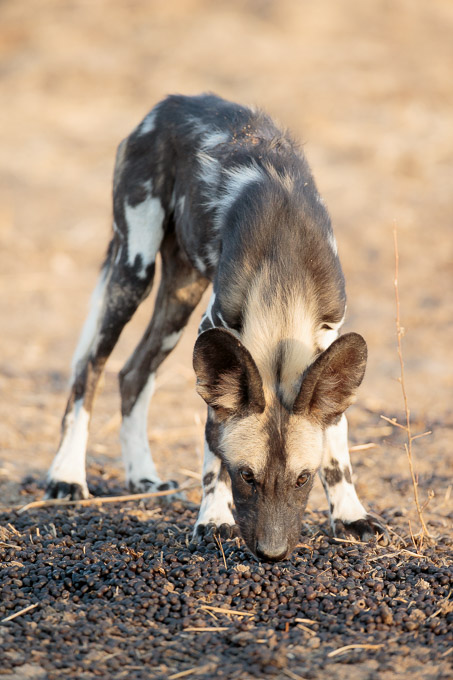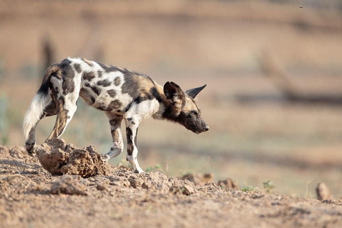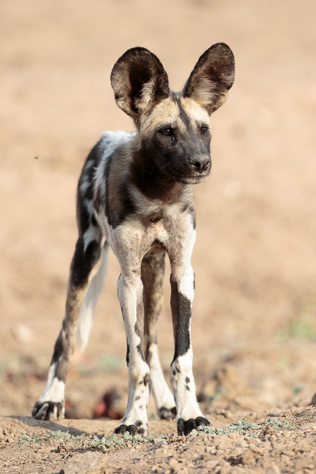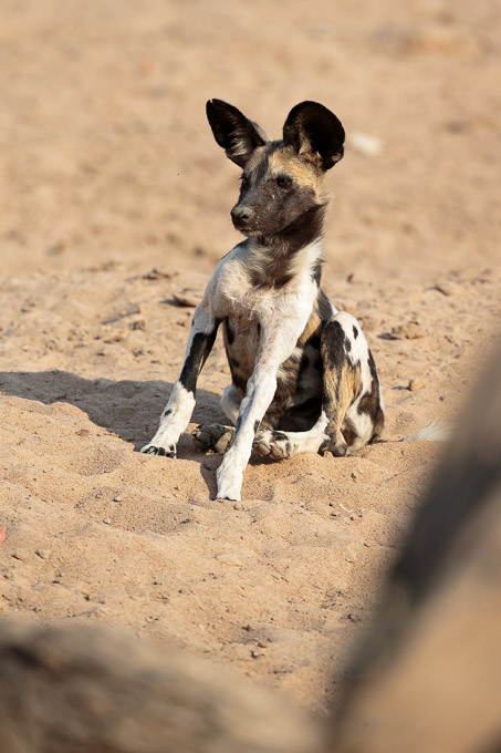 It all started when we went to look for a pack of dogs who had been seen regularly in the north of the park. We set out from camp, and immediately bumped into a completely different pack of dogs, drinking from the waterhole behind the camp. They were in the distance, so we jumped out of the vehicle with the scout and walked towards them. I left my camera in the vehicle as there were other things that I had to concentrate on (!) but we managed to get to within 20m of them while the 2 pups played together and the adults roamed around, seeking out something to hunt. We followed them, and stumbled over a hyaena who was following the dogs in the hope of an easy meal. After a while, their long legs and superior fitness showed and we returned to the vehicle – a wonderful start to the day.