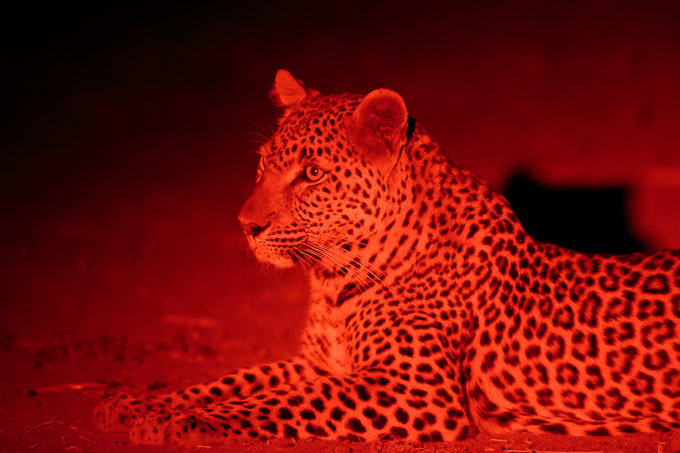 The guests were very keen to see leopard, and I scouted an area where I know a beautiful female can often be found. She was quickly located with the help of some puku, so we added a red filter to avoid disturbing her hunting.
