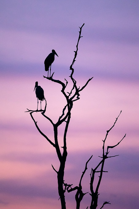 As it grew dark, we set off in search of other things, and found some Marabout storks settling in for the night. The warm sunset colours behind them made a beautiful silhouette.