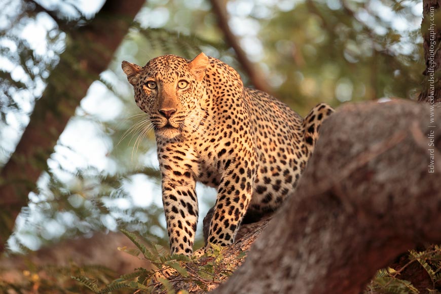 The moment I saw the leopard walking down the branch and into the golden light, I advised my guests to apply an exposure compensation of -2/3 or -1.