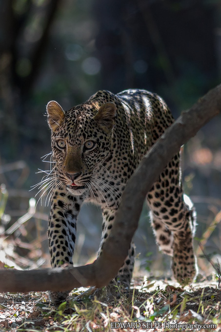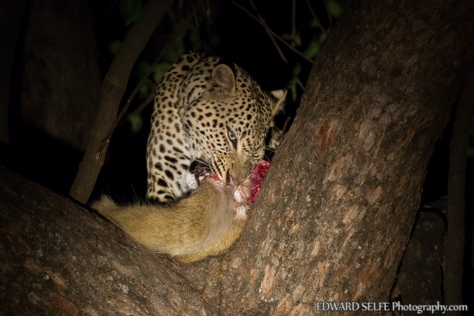 We found this female in a tree in the southern area of the park. She’d killed a baboon sometime earlier in the day and was feasting happily. As do all leopards, she was taking care to remove the hair before eating.