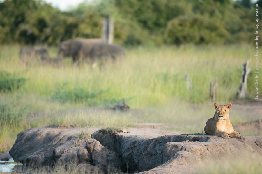We couldn’t find the lions that we’d heard calling but we saw footprints heading across a flooded sand river. We drove around (we have to use the bridge at this time of year!) and spotted a lone female calling repeatedly in an open plain we called Lupunga (after the grass type which is dominant there).
