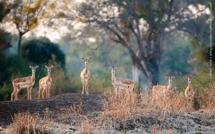 They are mixed feeders, taking both graze (grasses and herbs) and browse (such as leaves, flowers and fruits). When one source dwindles, they easily switch to another. Impala are often seen feeding on termite mounds in the dry season where nutrient-rich soil supports growth longer than in surrounding areas. These impala were happily feeding and lifted their heads only at the sound of my shutter!