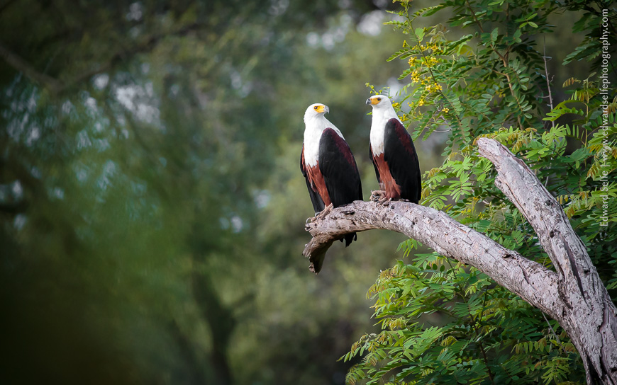 Large eagles often pair for life, or form a “long term pair bond” as it’s know to wildlife scientists. Fish Eagles are no exception, and I have enjoyed watching the same pairs hold territories for many years along some stretches of river. As can be seen from the photo above, males and females have similar plumage, but the female (on the left) is much larger than the male – up to 20% larger. This is common in many large raptors and is thought to result from the female’s need to grow and subsequently defend large eggs.