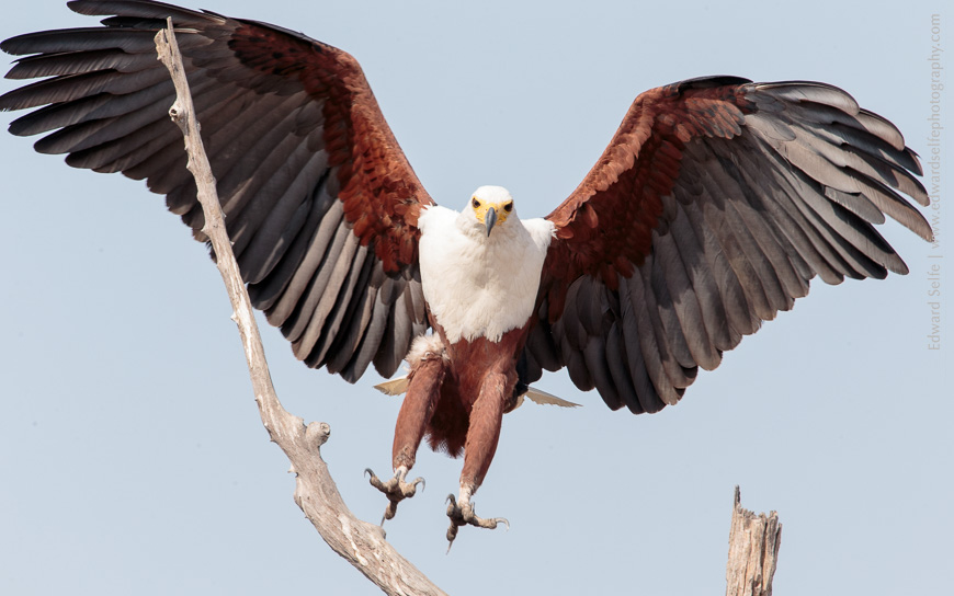 Fish Eagles are highly visible in Luangwa, and many of them have become very confiding, allowing close approaches and wonderful photographic opportunities. This one landed so close to us, that I clipped his wings!